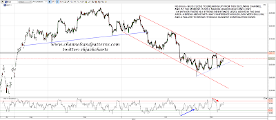 As with EURUSD CL has made a marginal lower low on positive RSI divergence. The setup is stronger on CL however as it has also broken short term declining resistance and formed a decent looking potential double-bottom. Key resistance is in the 87.5 area and a break over that opens up a run at the main declining resistance trendline currently just under 90. A break over 90 would open up a lot of potential upside and CL is an interesting looking long here: