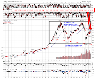 SPX has been bumping up against a key resistance level in the last few days, and that has been the 200sma on the SPX weekly chart. That was the trendline that marked the peak in April this year and it is at 1194 now, slightly below the SPX close last night. A cross of this trendline with confidence will place the last cherry on top of the already bullish larger technical picture here, and a break of this level with confidence now should eliminate the possibility that we will retest the IHS neckline at 1130 before playing out to the target at 1244:
