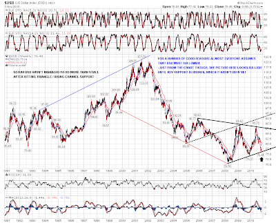 Looking at the overnight forex action, I think it is now almost certain that triangle support won't hold. If the Fed wants to devalue USD they are clearly in a position to do that, and that is just as clearly what we're seeing. All the grumbling about China recently has been less about fair exchange rates I suspect than an attempt to widen the USD devaluation to include currencies that are currently pegged to USD. Will US devaluation lead to protectionism and a trade war? Very possibly but not quite yet I suspect.