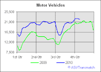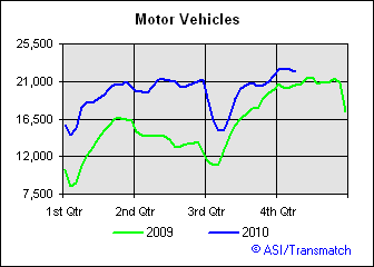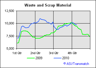 Waste and Scrap shipments are on par with last years levels.  These shipments don't give us a clear indication of strength or weakness.  Motor vehicle shipments are greater than 2009's dismal levels, but this should give us reason to pause and temper our elation.