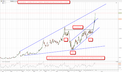 Silver is even closer to my target, and is rising so fast that I'm becoming concerned it may go straight through it. The (continuation) IHS target is in the 30 area and I have my target rising resistance trendline in the 29.80 area this week. My theory is that precious metals will make a major interim top when these targets are hit. We'll see: