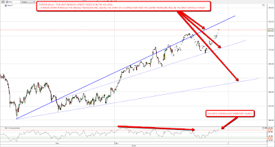 Equities have been trading sideways to up for the last few days, while EURUSD has been moving down. If EURUSD reverses decisively and rises 400 odd pips from here to the top of the channel then we might well see that end, and equities move up quite a bit. One to watch and I am reminded looking at it that my ES daily rising wedge upper trendline was never hit. That would be in the 1270 area now.
