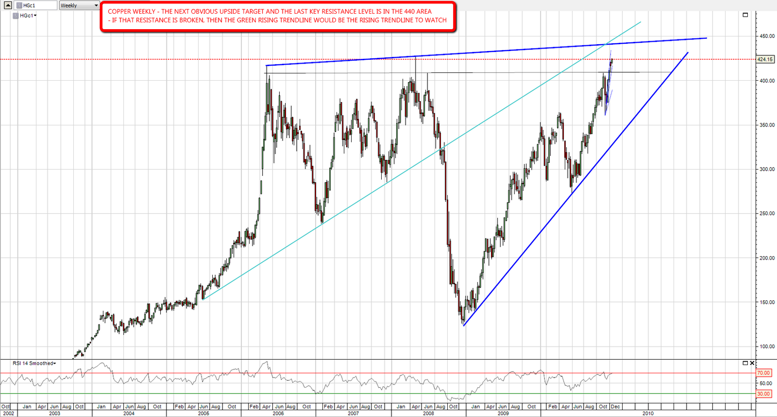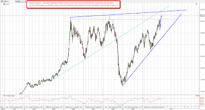On the weekly chart there is an obvious target for copper in the 440 area and that is pretty much the final major resistance trendline on the copper chart. if that is broken then the upside looks wide open, though I have drawn in a green trendline that would then be the trendline to watch.