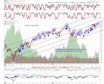 It's been very boring watching the market grind steadily higher this week, and I'm wondering now whether we'll see any correction next week. We're overdue a visit to the SPX daily 20SMA and I'm expecting to see a return to that soon, but quite a number of significant milestones were passed this week, and I'm wondering now whether we'll see 1280 before correcting. I've marked up the current rising wedge on the daily SPX, and also the main SPX rising channel since March 2009, onto my daily 20SMA chart to give a good idea of exactly where SPX is now within that bigger picture: