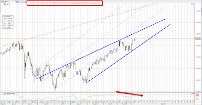 Oil is still in the rising channel that I've been posting for a few weeks and the next channel target is in the 91.4 area. I was wondering about possible resistance at the 90 level as I did the chart below but as that has now broken I'm expecting to see the 91.4 target hit soon. That could well be a significant interim top for oil though I do have another target in the 95 area if 91.4 doesn't hold:
