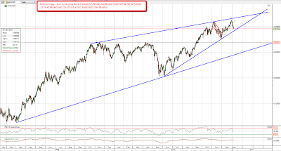 One of those to watch is definitely GBPUSD, where there is a clear falling wedge within a very possible rising channel. I'm expecting a move down below 1.53 to hit the falling wedge support trendline and the notional rising channel lower trendline and at that point we'll see which way GBPUSD breaks. Falling wedges are obviously bullish patterns, but they break downwards about 30% of the time: