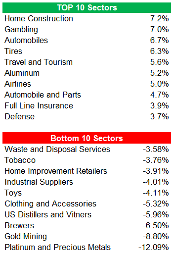 Automobiles and Parts was the big sector winner. GM (+5.75%) and F (+8.8%) were big contributors along with LEA (+7.18%) and MGA (14.83%). HOWEVER, the auto parts stores had a drag of a week. Big sector losers were Gold Miners and Platinum and precious metals–largely a reaction to the USD's strength. Here are the top/bottom performers (using sub-sectors):