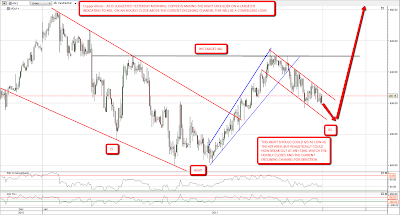 I posted some ambitious upside targets on EURUSD and GBPUSD yesterday morning and they both delivered the expected big rises to my target areas. The move on EURUSD particularly looks very impulsive and I am now working on the assumption that EURUSD has made a major interim low, though we'll have to see EURUSD break above 1.35 to confirm that. Short term I'm expecting some retracement that I'd expect to see bottom in the 1.31 to 1.33 area. An odd pattern has formed on EURUSD that I and others have seen before and could be an previously unidentified bottoming pattern. I'm provisionally christening this pattern the 'resting bat' reversal pattern as it looks somewhat like a bat's head with two long ears. Credit to my friend Bloodwine for coming up with the bat's head description: