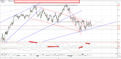 Copper is the standout indicator here from the ones that I generally watch. It bounced off a main support trendline last week, and has formed a sloppy triangle since. If it breaks up from the triangle, then it too will turn bullish, but key support is just below, and if that breaks then copper will looks very bearish: