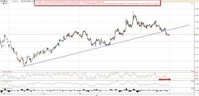 Copper has broken down from the 1.45 area to some serious support in the 435 area. As with EURUSD, no serious technical damage has yet been done, but an hourly close below 434.50 would break the short term uptrend: