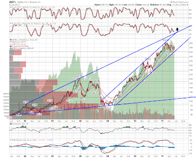 It's the longer timeframe that's more interesting on AAPL though, and you can see on my six year weekly chart where I'm thinking AAPL is headed. As long as the current rising channel holds I'm thinking the next move up on AAPL should reach long term resistance in the 400-20 area: