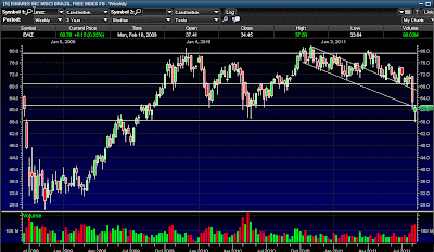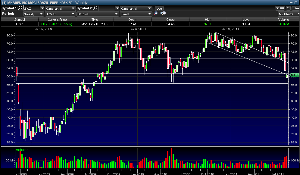 I entered a short on the Brazil ETF today after it managed to fight a great fight back from the $56 area all the way to overhead resistance at $61.50. For several days I've been highlighting this area as a great place to enter a short as the $61.50 area served as great support previously and now serves as overhead resistance. I also like the trade because I can now have a clear stop out point on the trade that will limit my downside risk if markets continue to move skyward.