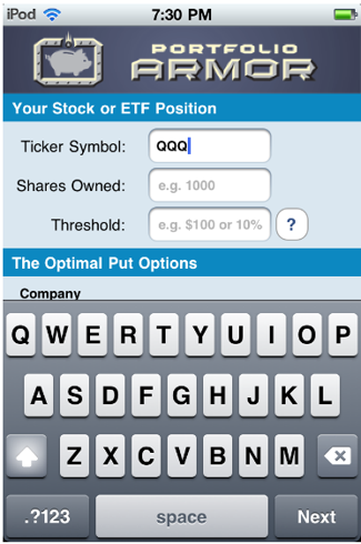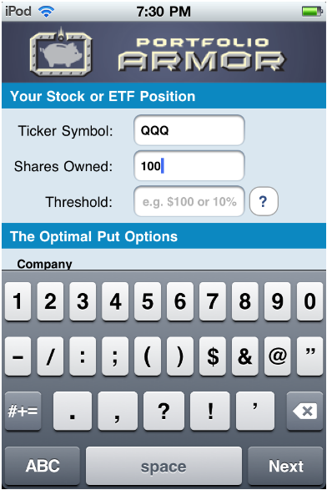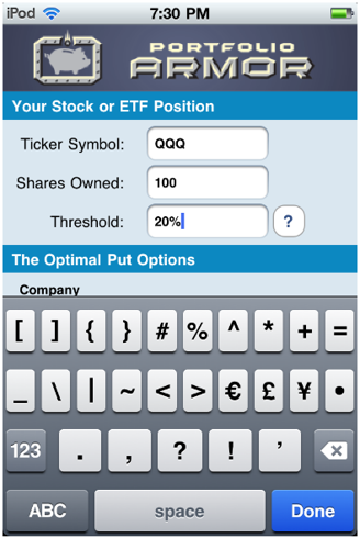 Optimal puts are the ones that will give you the level of protection you want at the lowest possible cost. As University of Maine finance professor Dr. Robert Strong, CFA, has noted, picking the most economical puts can be a complicated task. With Portfolio Armor (available on the web and as an Apple iOS app), you just enter the symbol of the stock or ETF you're looking to hedge, the number of shares you own, and the maximum decline you're willing to risk (your threshold). Then the app uses an algorithm developed by a finance Ph.D to sort through and analyze all of the available puts for your position, scanning for the optimal ones.