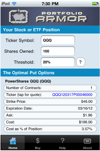 A moment after tapping the blue button, you'd see the screen cap below, which shows the optimal put option contracts to buy to hedge 100 shares of QQQ against a >20% drop between now and March 16, 2012. Two notes about these optimal put options and their cost: