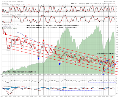 While I'm throwing round big targets this morning,. I should mention my 26 year channel on 30yr treasury yields (TYX). I've posted this a few times before, but if you look at the chart you can see that the next obvious target for TYX within this channel is under 20. Could it make it? Possibly, under a Japanese style scenario which I'm preparing a post to examine. Meantime it's hard to see a decent floor under bond yields regardless of deteriorating sovereign credit, as the main determinant of bond prices at the moment is fear of holding equities. Food for thought: