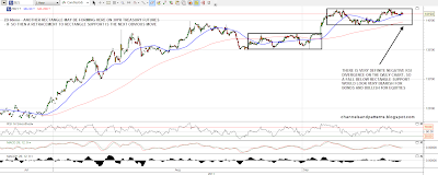 Looking round there are a couple of warning signals for bears here. 30yr treasury futures (ZB) may be forming another rectangle and the next obvious move is to rectangle support. If rectangle support breaks then the picture may become very bearish for bonds and bullish for equities as there is sharp negative RSI divergence on the daily charts:
