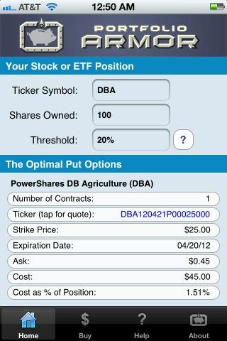 Below is a screen capture showing the optimal put option contract to buy to hedge 100 shares of DBA gainst a greater-than-20% drop between now and April 20, 2012. A note about these optimal put options and their cost: to be conservative, Portfolio Armor calculated the cost based on the ask price of the optimal puts. In practice an investor can often purchase puts for a lower price, i.e., some price between the bid and the ask.