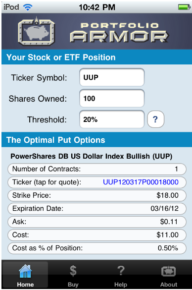 Optimal puts are the ones that will give you the level of protection you want at the lowest possible cost. Portfolio Armor (available on the web and as an Apple iOS app), uses an algorithm developed by a finance Ph.D to sort through and analyze all of the available puts for your stocks and ETFs, scanning for the optimal ones.