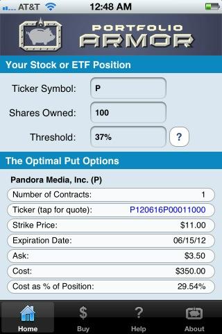 Below is a screen capture showing the optimal put option contract to buy to hedge 100 shares of P against a greater-than-37% drop between now and June 15, 2012. A note about these optimal put options and their cost: to be conservative, Portfolio Armor calculated the cost based on the ask price of the optimal puts. In practice an investor can often purchase puts for a lower price, i.e., some price between the bid and the ask.