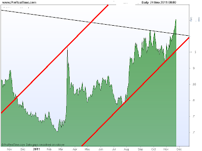First let me go back to my post here.  I drew up a simple model where I expected prices to go…Just with this simple model, you could of made a nice 6 figures in the futures market… aside from the whipsaws we had in the triangle formation(which was very irritating to say the least). Notice I had the black line drawn out before prices fell sharply on Oct 27th in which I called bullshit. And although the chart below could still be in the cards, I have a feeling we will break the October Low just from looking at certain charts…… However it is still the only bull case scenario I see from here. But again my hunch from looking at Portugal, France, and etc is that we could break the Oct low, destroying any chance of an inverted H+S formation.