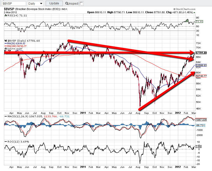 My post of February 27th made reference to the Emerging Markets ETF versus the BRIC countries. On that date, I mentioned that "Inasmuch as price on all of these instruments is trading below major resistance in the presence of negative divergences on indicators, and (with the exception of Brazil) are still subject to the influences of bearish moving average Death Cross formations, we may see a pullback occurring at some point soon. I'd keep a close watch on Russia and China for indications of possible weakness developing which may also affect the other indices and ETF…India has already been dropping and may be the signal that the others will follow suit."