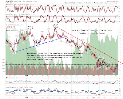 Natural gas has been in a decline for so long that it seems hard to imagine it trending up. Nonetheless a possible low setup is forming and it has made a short term higher high. If NATGAS can make it over declining resistance in the 2.65 area then the downtrend from last June should be broken: