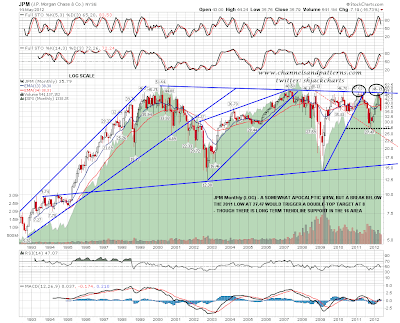 I don't often post charts for individual stocks but I have a very nice long term chart on JPM that I'd like to share. You can see that JPM reversed exactly at declining resistance from 2000 on this monthly (LOG scale) chart, and that a double top may be forming with a target in the (cough) 8 area on a break below the October low at 27.47. There is some long term trendline support in the 16 area that might hold on the way there however. Will this play out? Who knows? I wouldn't be keen to buy this current dip on JPM though.