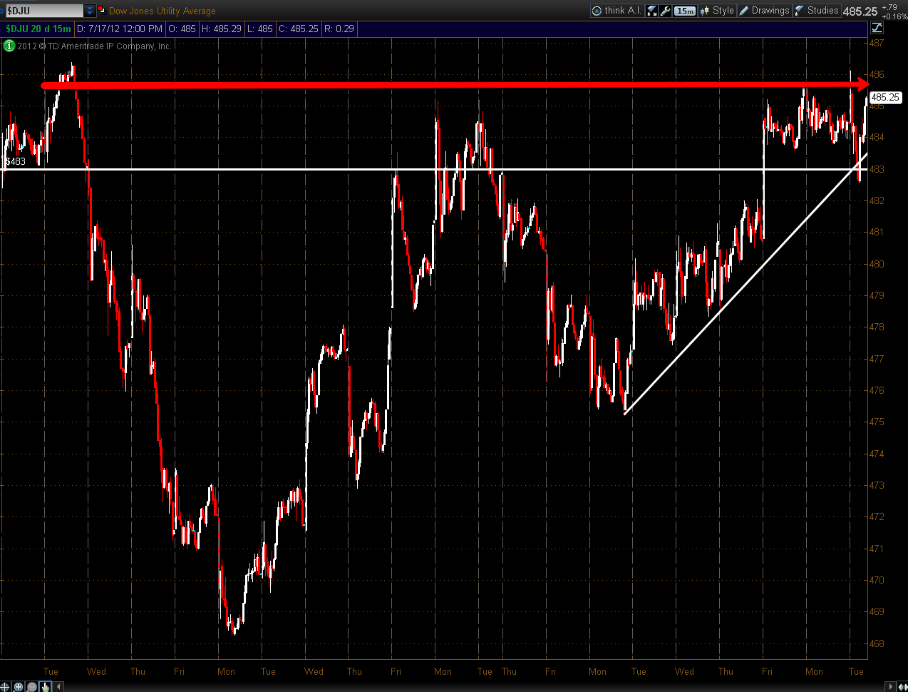 Further to my post of July 16th, a near-term support level of 483.00 has been re-tested and is holding, so far, on the Utilities Index, as shown on the 15 min chart below…one level that I'm watching relative to weakness/strength on the other Major Indices. Near-term resistance of 485.60-486.00 lies overhead and would need to be overcome in order to push the other markets higher.