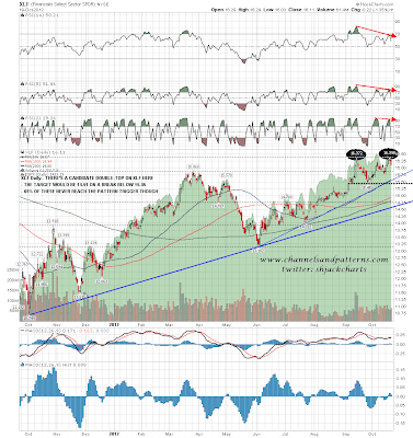 Looking around various indices XLF caught my eye this morning. There is a possible double-top there that would trigger a target at 14.51 on a break below 15.45. 65% of these never make it back to the trigger level but the negative RSI divergence is significant. XLF has been leading lately so this is something to watch: