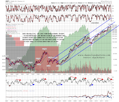AAPL broke towards 520 area support but that isn't as good support in my view as 565 area support was. On the bigger picture on AAPL here is the updated version of the longer term chart I posted on 13th September when I first started looking at the bear setup on AAPL. This is the rising channel on the weekly (LOG) chart, and as I noted then, longer term support is slightly above 400, and the scale of that decline would be in line with all but one of the five previous declines signaled on the weekly RSI over the last twenty years. AAPL is now well over halfway to that target and may reach it: