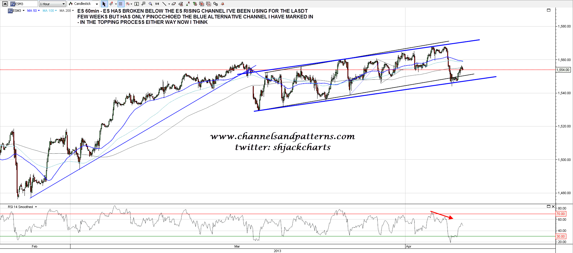 The smaller channel that I’ve been watching on ES broke down yesterday after the little double-top I was talking about yesterday morning broke down and made target. Looking at it again this morning though I have drawn in an alternate channel which has only been pinocchioed so far. Either way ES/SPX is now most likely in the topping process:
