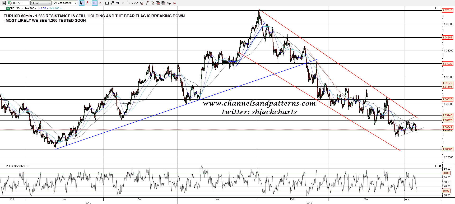 On EURUSD resistance at 1.288 is still holding and the bear flag there is breaking down. The next big support level is in the 1.266 area: