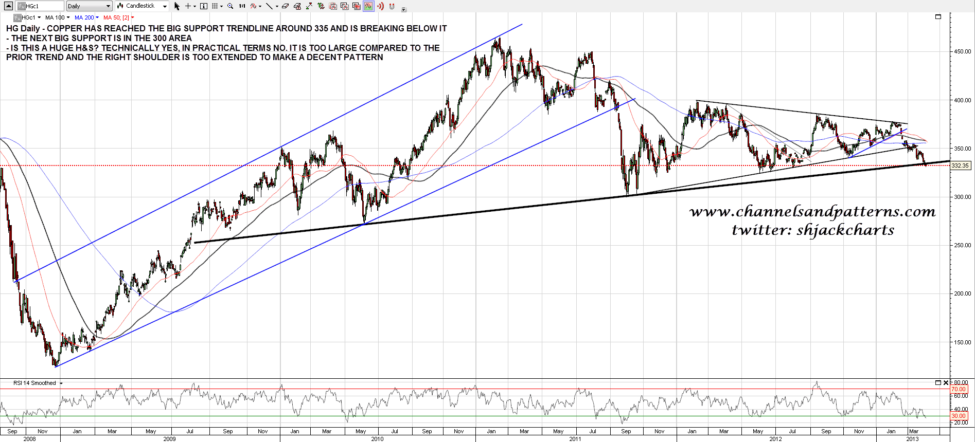 Copper has made my trendline support target in the 335 area and has broken below it. The next big support is in the 300 area: