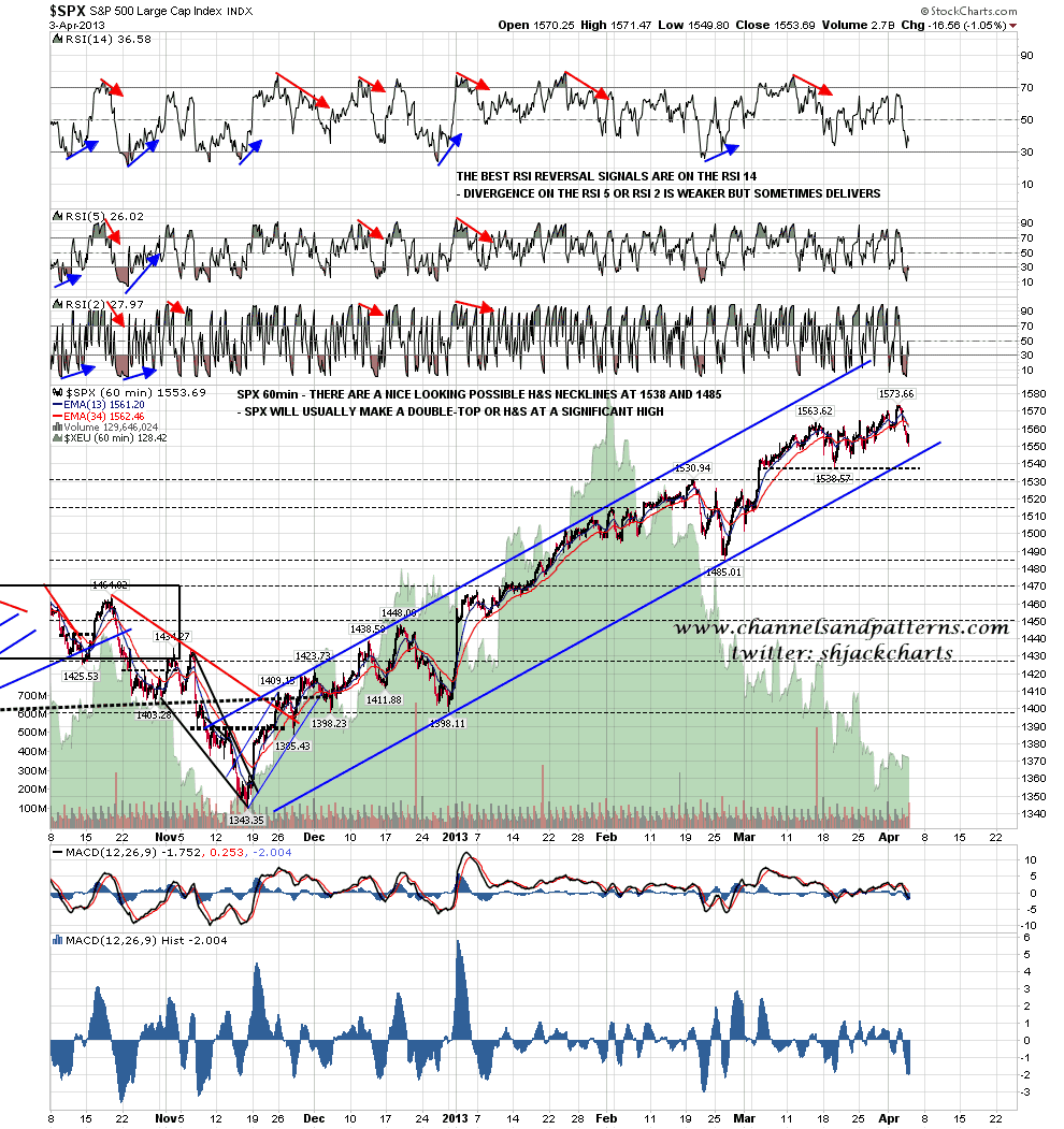 SPX usually makes significant highs with either a double-top or an H&S. There are two candidate H&S necklines here and they are in the 1538 and 1485 areas. A hit of the 1538 level would require a break below rising channel support which is now in the 1543 area: