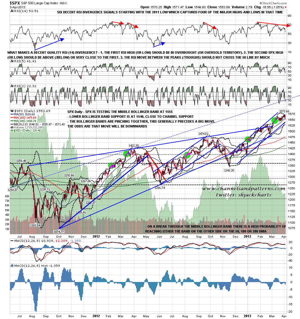 On the SPX daily chart SPX tested the daily middle bollinger band yesterday and the lower bollinger band is now at 1540, in the same area as rising channel support: