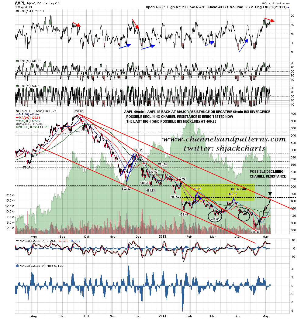 AAPL has had a strong move up from the 385 low, and has now reached an important inflection point at possible falling wedge turns into declining channel resistance. There is definite negative 60min RSI divergence here and at least a retracement looks likely soon. The last short term high was at 469.95 and that is a possible IHS neckline:
