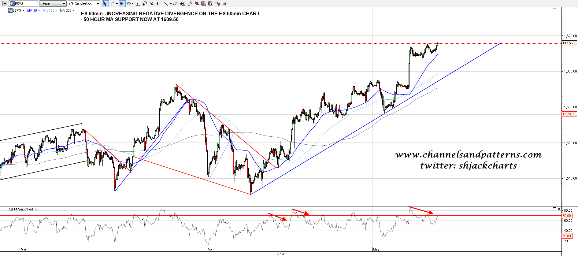 On ES I have rising support from the 1531 low in the 1594 area, and the 50 hour MA is now in the 1609.50 area: