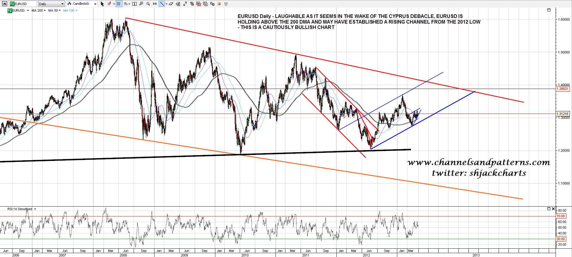 I’ve been having a careful look at EURUSD this morning and the last retracement may have established a rising channel from the 2012 low. EURUSD is also holding above the 200 DMA, and as long as that remain the case this EURUSD daily chart looks cautiously bullish: