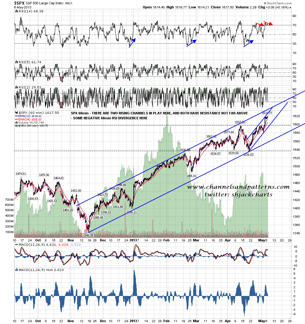 On the SPX 60min chart I mentioned at the 1536 low that rising support from the November low had been hit, and that SPX needed to break back below that soon for any decent retracement to happen. That trendline is now primary trendline support for the move up from the November low, and I have probable channel resistance there in the 1630-5 area. There is some negative RSI divergence at the high yesterday that is worth noting, though the move since Friday’s push up looks like a bull flag consolidation: