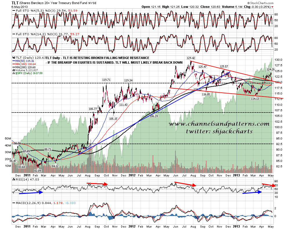 Now that SPX has firmly broken over resistance I have been carefully considering the trendline setup here on SPX. That’s not to say that the short term bear case is entirely dead yet, but it is mostly dead and I won’t be considering it seriously unless we see a very sharp retracement below broken resistance in the very near future. One of the last wisps of hope here for the bear case here is the TLT chart, which still hasn’t yet broken back below broken falling wedge resistance and the 200 DMA in the same area. It’s also worth noting of course that SPX has not yet broken above negative RSI divergence on either of the SPX daily or weekly charts: