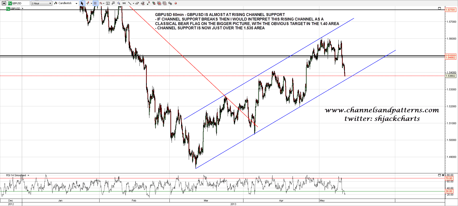 I posted the GBPUSD chart a couple of days ago forecasting a return to rising channel support, and we may well see that test today. That again is a very important inflection point on something I am using here as an inverted proxy for USD. If we see a bounce there then the current upward trend will continue but if GBPUSD breaks below rising channel support then I would interpret this rising channel as a a bear flag on the bigger picture. That bearish break on GBPUSD would have an obvious target at long term support in the 1.38 to 1.42 area, so that would look very bullish for USD and very bearish for GBPUSD, EURUSD and most other currencies against USD. This is one to be watched carefully: