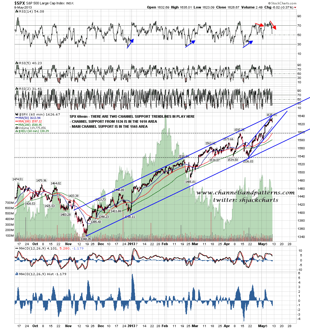 In terms of trendline support on the 60min chart, there are two levels of channel support. the first is in the 1610 area, and main channel support is in the 1565 area. However we have not yet seen a touch of main channel resistance, and I am not expecting a test of main channel support until channel resistance has first been tested. There was some negative 60min RSI divergence at the high yesterday: