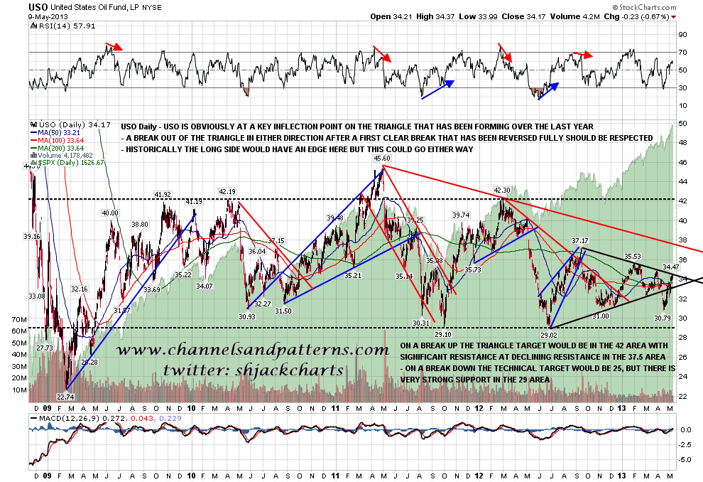 CL is heading for a test of rising support overnight, and that’s now in the 93 area. I’ve been saying for a few days that the level of the current CL high is an important inflection point and I’ll illustrate that this morning with the USO daily chart, where you can see that level is the resistance trendline on a year old triangle. The triangle has already broken down once and recovered back into triangle resistance, the direction of any second break now in either direction should be respected. I’ve marked the targets and important levels for a breakout in either direction on the chart: