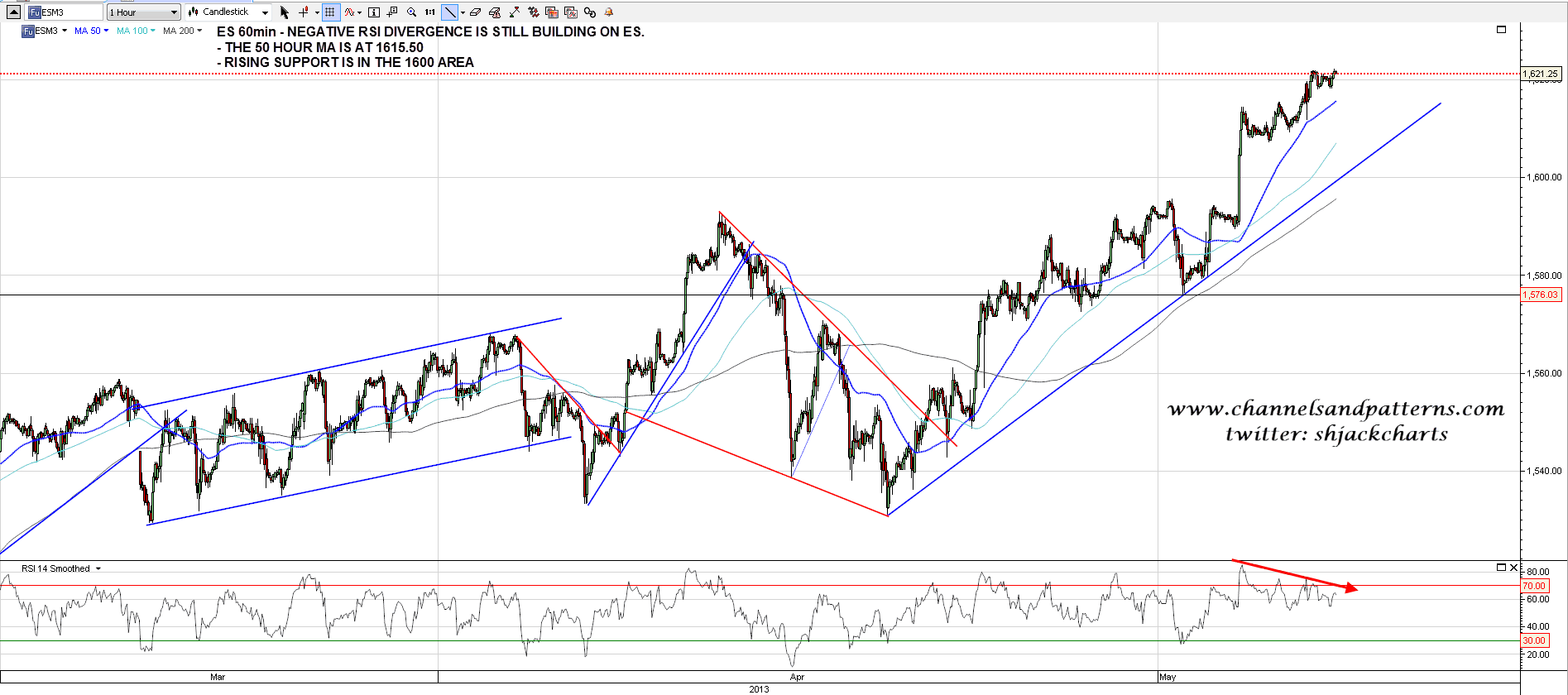 On ES I have support at the 50 hour MA in the 1615.50 area and rising support for the current move in the 1600 area. As with the SPX 60min negative divergence has been building all week: