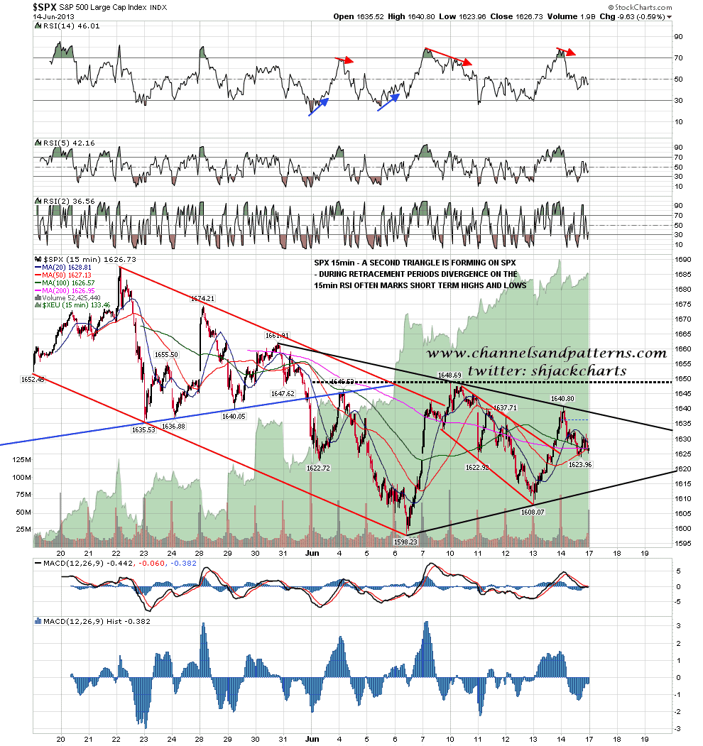 I posted a couple of charts on twitter after the close on Friday, and the first was the direction neutral symmetrical triangle that is now clearly forming on the SPX 15min chart:
