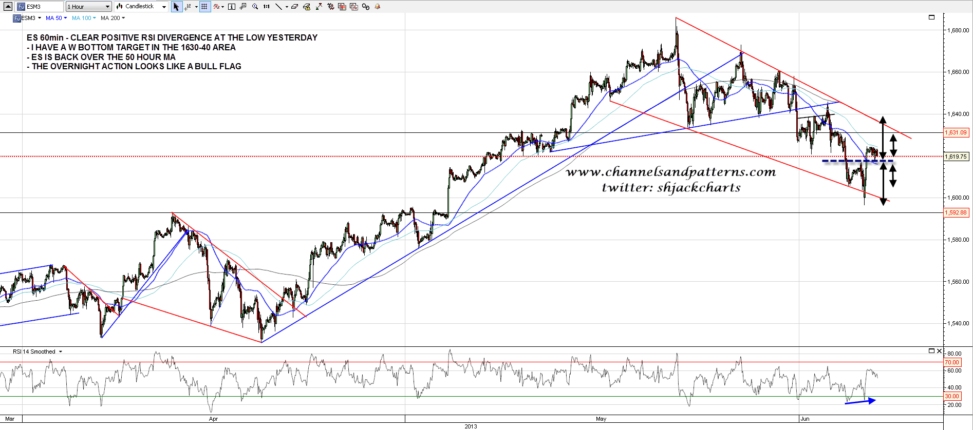 The setup also looks pretty solid on the ES 60min chart, where there was a clear W bottom that broke up and retested, with positive RSI divergence at the low. I have the target in the 1630-40 range depending on how the target is calculated. ES is back over the 50 hour MA and the overnight action looks like a bull flag. ES 60min chart: