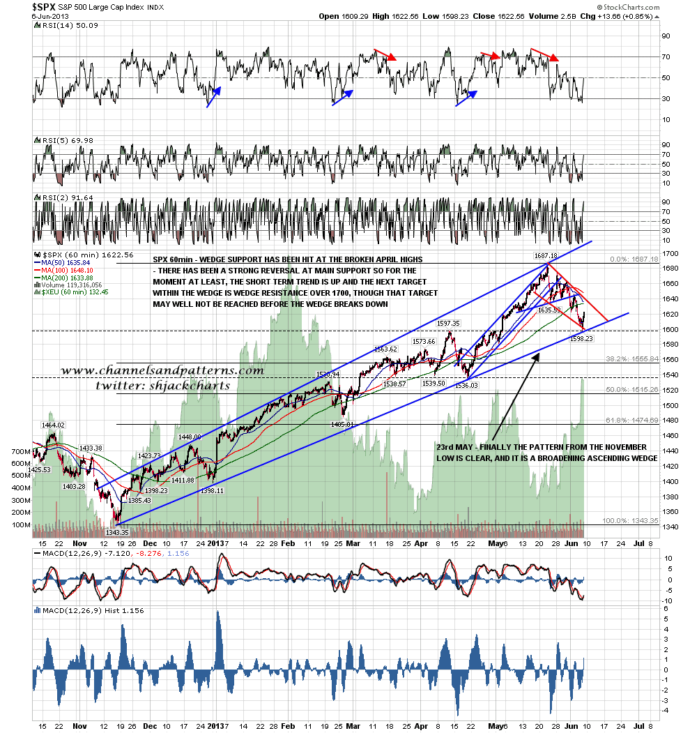 I posted the SPX 5min chart below on twitter yesterday shortly before the low. That was before the final spike down to make the low but I was showing the falling wedge that has formed there and the obvious next move to test wedge resistance in the 1635-40 area. SPX 5min chart (yesterday intraday):