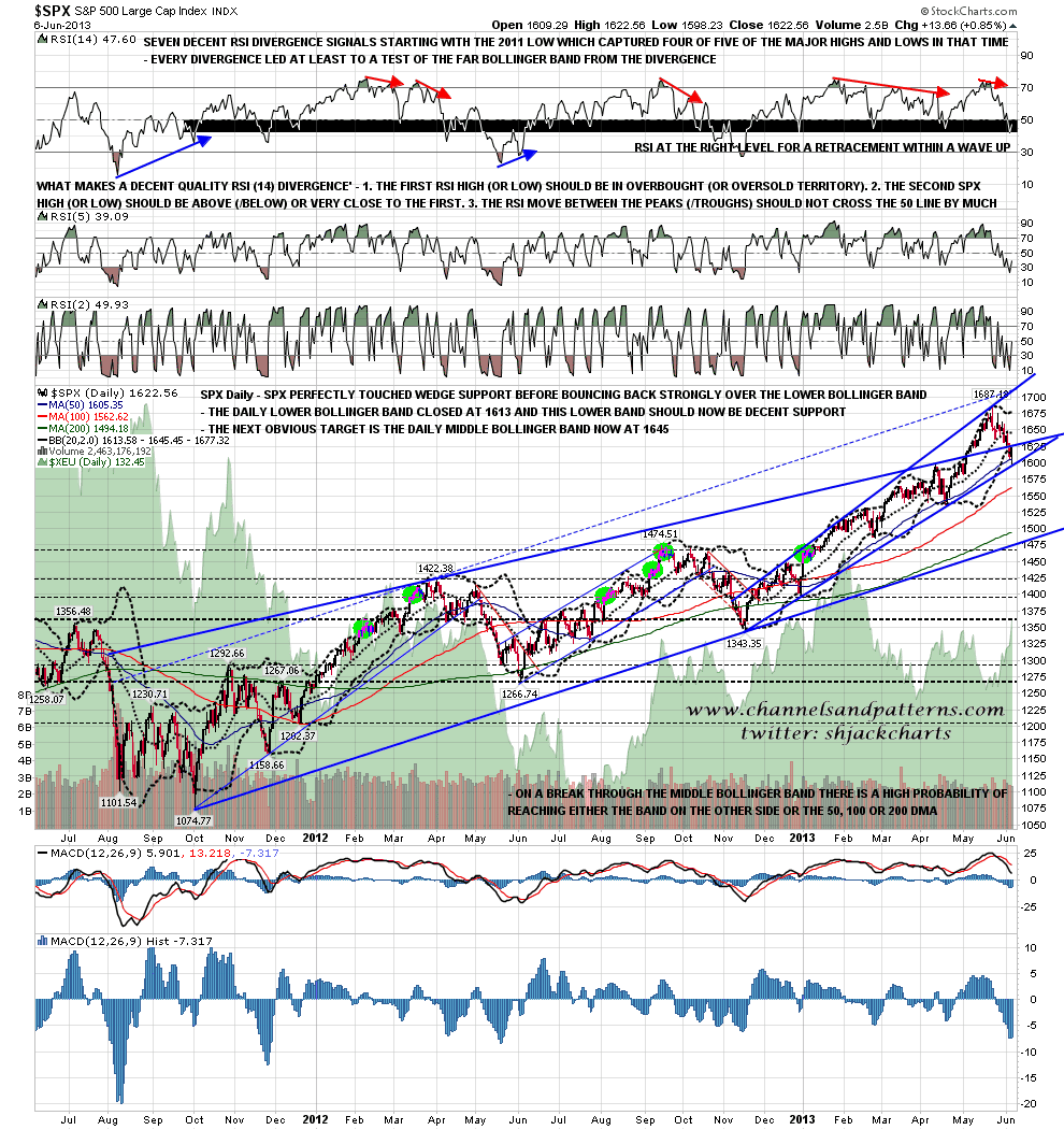 I gave main support yesterday in the 1595-7 range, which was a little low as the target trendline was hit at 1598.23, though I posted on twitter shortly afterwards that the wedge support trendline had been hit. After that SPX bounced strongly and closed back well above the daily lower bollinger band. The next obvious target on the daily chart is the daily middle bollinger band, now in the 1646 area. SPX daily chart: