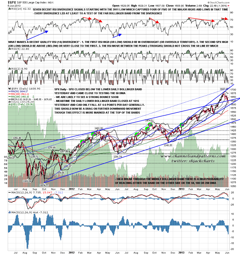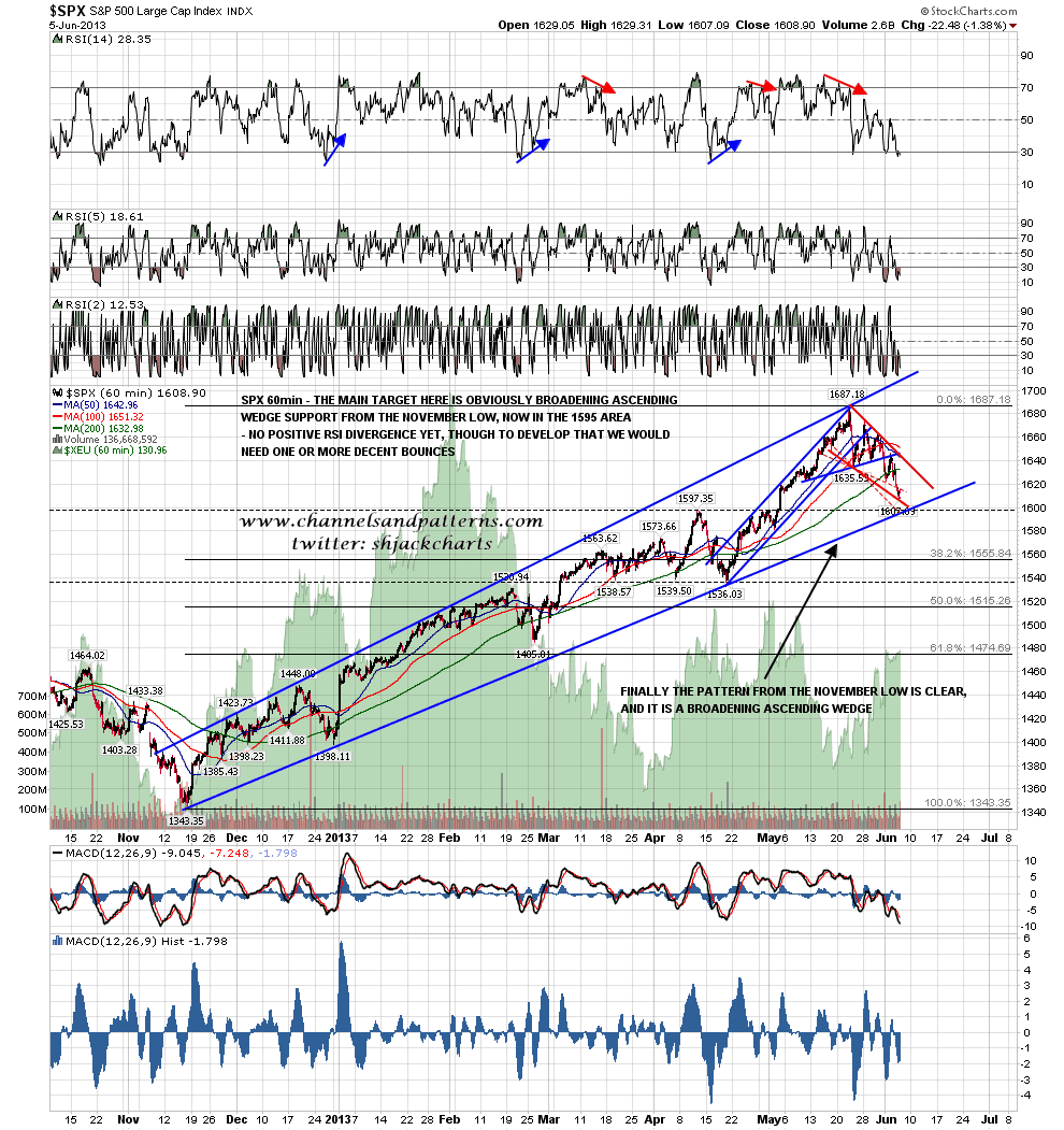 The primary target since my post on 23rd May identifying the broadening ascending wedge on SPX has been the wedge support trendline, and I now have that in the 1595-7 area. If we see some continuation down today then that is the obvious target and long entry level for a bounce. However we may well see a decent bounce before that target is reached, not least to establish the positive 60min RSI divergence that may well have developed by the time that target is hit. SPX 60min chart: