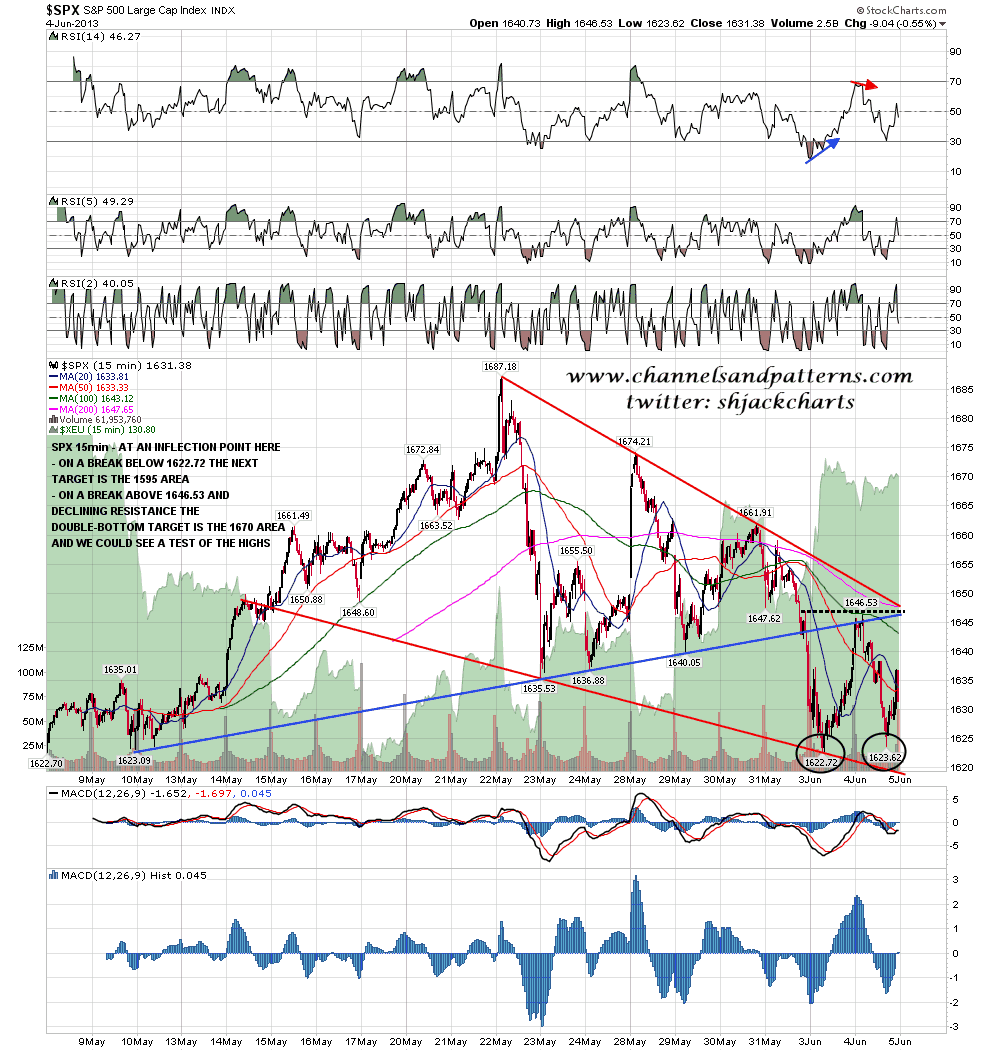 Looking at the SPX 15min chart the high yesterday was a retest of broken triangle support, but it has also set up a possible double-bottom. On a break with any confidence below 1622.72 I’d expect a move to test the 1595 area, but if we see a bounce today and then a break above both yesterday’s high at 1646.53 and declining resistance from the high in the same area then I would have a double-bottom target in the 1670 area and we could well then see a test of the highs. SPX 15min chart:
